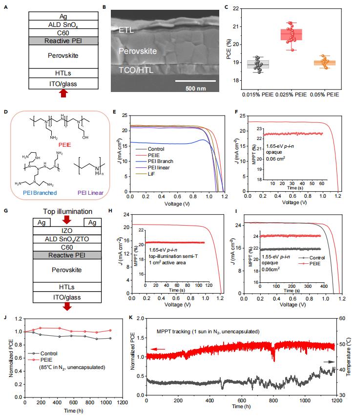(C)不同濃度PEIE鈍化的鈣鈦礦太陽(yáng)能電池的光電轉(zhuǎn)換效率(PCE)統(tǒng)計(jì)分布。箱線圖展示了數(shù)據(jù)的五數(shù)概要:*小值、*大值、樣本中位數(shù)以及第一和第三四分位數(shù)。(D) PEI聚合物的不同構(gòu)型。(E) 使用不同PEI聚合物和LiF鈍化的p-i-n電池的J-V曲線。(F) 使用PEIE鈍化的1.65 eV p-i-n電池(面積=0.06 cm²)的J-V曲線和穩(wěn)態(tài)效率。穩(wěn)態(tài)效率通過*大功率點(diǎn)跟蹤(MPPT)獲得。(G) p-i-n頂照半透明(semi-T)太陽(yáng)能電池的器件結(jié)構(gòu)。(H) 使用PEIE鈍化的大面積(1 cm²)半透明1.65 eV p-i-n電池的J-V曲線和穩(wěn)態(tài)效率。(I) 使用PEIE鈍化的1.55 eV p-i-n電池(面積=0.06 cm²)的J-V曲線和穩(wěn)態(tài)效率。(J 和 K) 在加速條件下,PEIE鈍化的p-i-n電池的長(zhǎng)期熱穩(wěn)定性(J)和連續(xù)MPPT運(yùn)行穩(wěn)定性(K)。