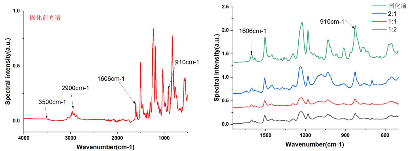 圖4胺固化雙酚A環(huán)氧樹脂膠按2:1、1:1、1:2均勻混合并在室溫固化4h后測(cè)定的光譜