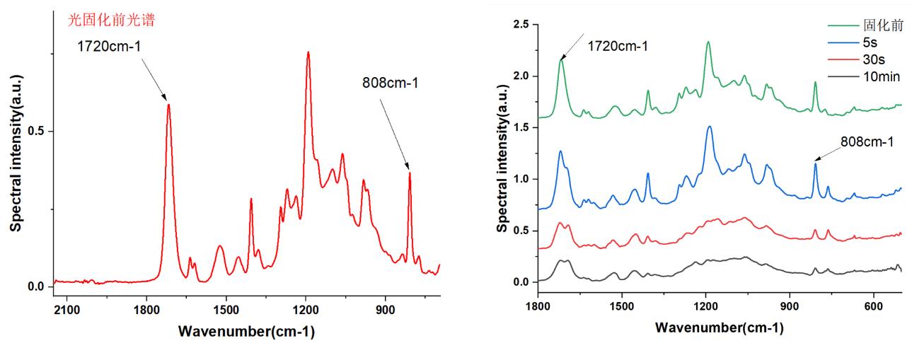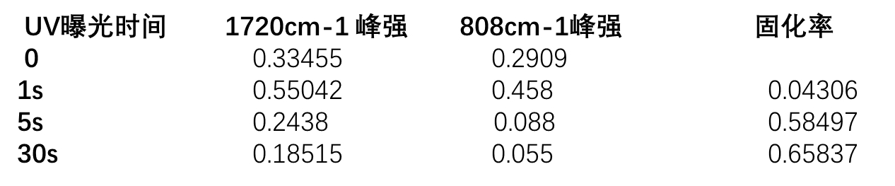 圖5和表3是UV固化環(huán)氧丙烯酸酯的固化率測(cè)試結(jié)果,實(shí)驗(yàn)中將樣品從黑色儲(chǔ)存罐中取出后,涂覆在襯底上,以不同的曝光時(shí)間放置在紫外燈下固化后取出,并放置在ATR壓頭下紅外光譜測(cè)試。UV膠在紫外光照射下,其中的C=C反應(yīng)生成C-C。從圖5可以看到主要特征峰位保持不變。C=C伸縮振動(dòng)位于1696-1640cm-1之間,峰的范圍較寬,容易和其他峰重疊,故不選。雙鍵上的C-H伸縮振動(dòng)位于3095-2995cm-1之間,容易和苯環(huán)C-H鍵重疊,也不選。而碳碳雙鍵的C-H面外形變振動(dòng)位于1010-667cm-1之間,UV膠常見于810±5cm-1位置,該區(qū)域峰相對(duì)單一且強(qiáng)度大,故選為特征峰。UV膠中C=O不參與反應(yīng)且強(qiáng)度大,固選為內(nèi)標(biāo)峰進(jìn)行計(jì)算[4]。從表3可以看出,UV膠在曝光5秒后固化率達(dá)到58.4%,而在曝光30s后固化率達(dá)到65%,基本形成固化??梢娍焖贉y(cè)量對(duì)UV固化膠很重要。