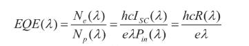 定義為單位時(shí)間內(nèi)外電路中產(chǎn)生的電子數(shù)與入射的單色光子數(shù)之比。IPCE 的概念更多用在光電化學(xué)類器件上,在定義上與EQE 是類似的。