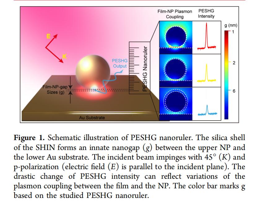 本篇文章的核心內(nèi)容是關(guān)于一種新型的非線性等離激元納米標(biāo)尺(plasmon nanoruler),它利用表面等離激元增強(qiáng)二次諧波(PESHG)機(jī)制來實(shí)現(xiàn)超高靈敏度的納米尺度距離測(cè)量(如圖1所示)。