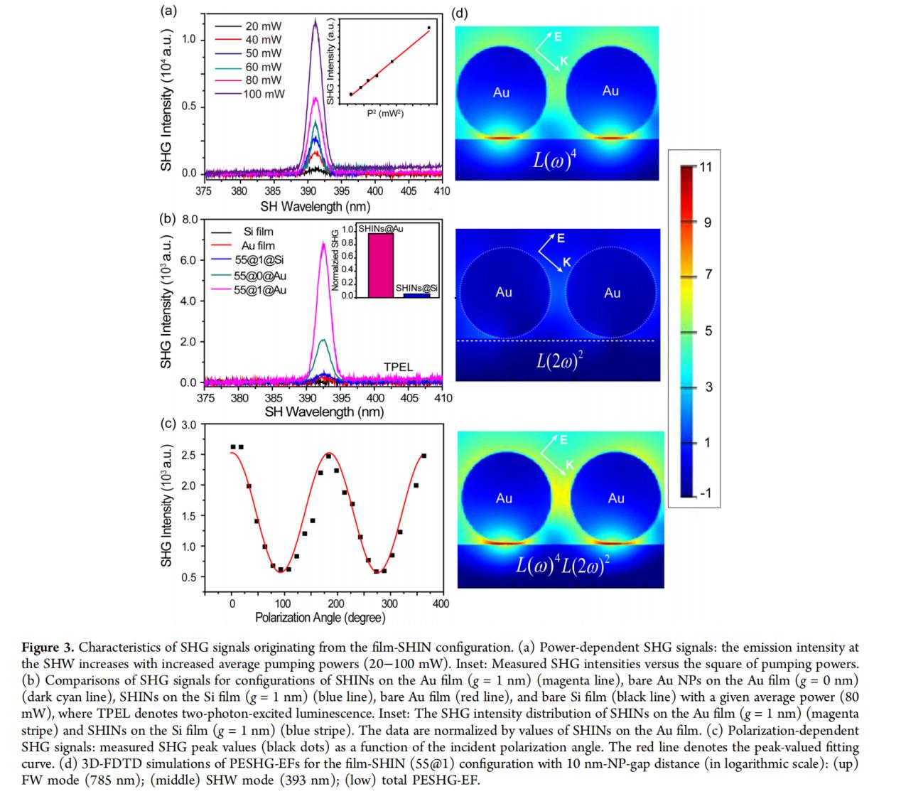 通過在金膜上放置具有不同厚度二氧化硅殼層的SHINs,構(gòu)建了film-SHIN構(gòu)型(如圖2所示)。使用可調(diào)諧的鈦寶石激光器進(jìn)行SHG測(cè)量,入射角為45度,以優(yōu)化信號(hào)強(qiáng)度和減少背景噪聲。采用三維時(shí)域有限差分法(3D-FDTD)計(jì)算模擬以驗(yàn)證實(shí)驗(yàn)結(jié)果,并分析PESHG增強(qiáng)因子(PESHG-EF)與納米間隙大小之間的關(guān)系。從而得到了不錯(cuò)的實(shí)驗(yàn)結(jié)果。
