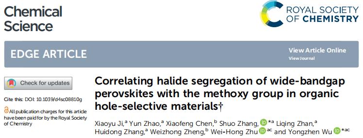 分享一篇來自華東理工大學(xué)吳永真團隊的新研究成果,本文以“Correlating halide segregation of wide-bandgap perovskites with the methoxy group in organic hole-selective materials”為題發(fā)表于期刊Chemical Science,原文鏈接:https://doi.org/10.1039/d4sc08810g。希望對您的科學(xué)研究或工業(yè)生產(chǎn)帶來一些靈感和啟發(fā)。