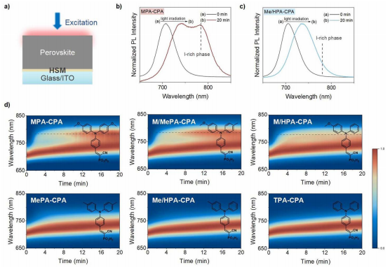 圖1 (a)光致發(fā)光(PL)實驗示意圖。(b)在MPA-CPA和(c)在Me/HPA-CPA上沉積的1.76 eV鈣鈦礦在光照射20分鐘后的光致發(fā)光光譜。(d)利用MPA-CPA、M/MePA-CPA、M/HPA-CPA、MePA-CPA、Me/HPA-CPA和TPA-CPA作為HSMs,跟蹤1.76 eV鈣鈦礦在20分鐘內(nèi)的光致發(fā)光光譜變化。比例尺表示鈣鈦礦薄膜的歸一化光致發(fā)光強度,虛線表示碘富相的出現(xiàn)。