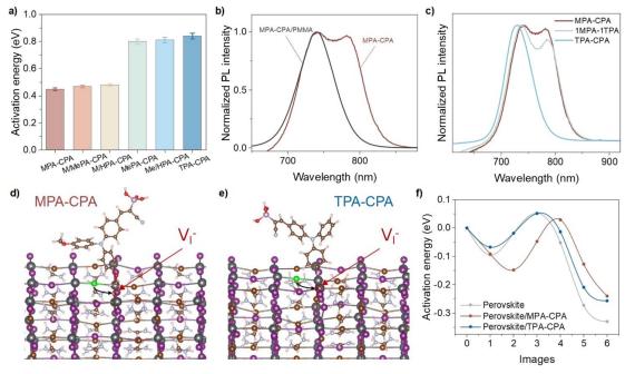圖2 (a)在不同HSMs上沉積的鈣鈦礦薄膜中PIHS的活化能。(b)在MPA-CPA或MPA-CPA/PMMA上沉積的鈣鈦礦在光照20分鐘后的歸一化PL強度。(c)在MPA-CPA和TPA-CPA混合HSMs上沉積的1.76 eV鈣鈦礦薄膜在光照20分鐘后的PL光譜。(d)MPA-CPA/鈣鈦礦模型和(e)TPA-CPA/鈣鈦礦模型中包含鹵素空位(VI?)的初始界面結(jié)構(gòu),分子的MeO基團在表面頂部上方1.554 Å的高度。(f)DFT計算鹵素離子遷移到相鄰鹵素空位的離子擴散活化能。