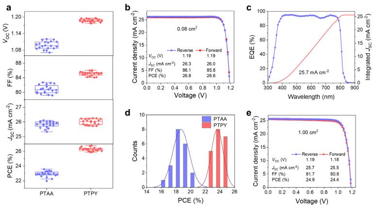 基于PTPY的PSCs在性能上也表現出色。在反向掃描中,PTPY基器件實現了26.8%的PCE,而PTAA基器件僅為23.6%。PTPY基冠軍器件展現出1.19 V的開路電壓(VOC)、26.3 mA cm-2的短路電流密度(JSC)和86.1%的填充因子(FF)。外部量子效率(EQE)光譜顯示,PTPY基器件的集成電流密度與J-V測量結果高度一致。此外,PTPY還展現出良好的可擴展性,在1 cm²的大面積器件中實現了24.9%的高效率。