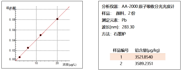 食品添加劑是指為改善食品品質(zhì)和色、香、味,以及為防腐、保鮮和加工工藝的需要而加入食品中的人工合成或者天然物質(zhì)。食品用香料、膠基糖果中基礎(chǔ)劑物質(zhì)、食品工業(yè)用加工助劑、營養(yǎng)強化劑也包括在內(nèi)?!妒称钒踩珖覙?biāo)準(zhǔn) 食品添加劑使用標(biāo)準(zhǔn)》(GB 2760-2024)中對食品添加劑*基本的要求是不應(yīng)對人體產(chǎn)生任何健康危害。此次天水幼兒園血鉛事件中違規(guī)使用顏料作為食品添加劑,那么在一般的顏料中鉛含量究竟是什么水平呢?圖1為卓立漢光AA-2000原子吸收分光光度計測定顏料鉛含量的示例,兩份樣品測出來的Pb含量高達3521.8540μg/kg和3589.2351 μg/kg??梢婎伭鲜墙^對禁止作為食品添加劑使用的。