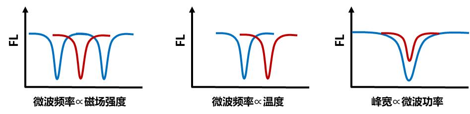 NV色心中的電子有三種自旋狀態(tài),可以用符號表示為|0〉、|+1〉和|-1〉。我們可以將其簡單理解為這是電子旋轉(zhuǎn)的三種“姿態(tài)”,對應(yīng)三個能級,或者稱為三個量子態(tài)。當(dāng)用一束特定波長的綠光去照射NV色心的時候,能把色心中的電子全部初始化到|0〉態(tài)。在|0〉態(tài),NV色心會以輻射發(fā)光的方式釋放激發(fā)態(tài)能量,發(fā)出紅色熒光,NV色心處于亮態(tài)。如果此時對NV色心施加微波場,當(dāng)微波頻率與 NV電子自旋躍遷能級差相等時,就會發(fā)生共振,NV色心便從|0〉 態(tài)躍遷到|+1〉和|-1〉態(tài),這時處于激發(fā)態(tài)的電子要經(jīng)過系間竄越過程,先到達(dá)暫穩(wěn)態(tài)后退激返回基態(tài),此過程不會輻射發(fā)光,因此會檢測到熒光計(jì)數(shù)下降,NV色心處于暗態(tài)。由于NV色心熒光具有自旋依賴性,我們可以用激光來探測NV色心電子順磁共振信號,該方法也被稱為光探測磁共振(Optically Detected Magnetic Resonance,ODMR)