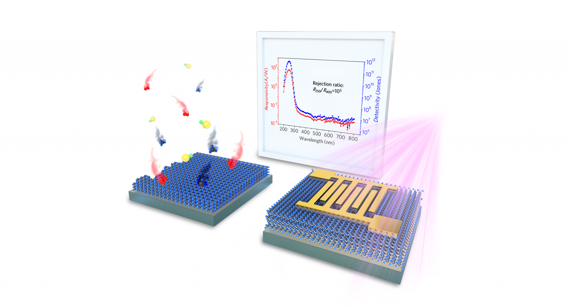 1、開發(fā)出了一種具有高性能和柵極可調(diào)光檢測能力的非晶氧化鎵日盲場效應(yīng)光電晶體管。采用磁控濺射這種方法可以在Si基襯底上生長低成本、大面積的非晶氧化鎵薄膜。通過對(duì)制備的薄膜晶體管施加適當(dāng)?shù)谋硸烹妷?,可以很好地控制場效?yīng)光電晶體管的暗電流和光響應(yīng)特性。制成的氧化鎵薄膜場效應(yīng)光電晶體管具有出色的深紫外光電探測特性,包括4.1×103 A/W的高光敏性, 2.5×1013Jones的高探測率。并首次基于非晶氧化鎵探測器作為單像素實(shí)現(xiàn)日盲成像,使得該日盲非晶氧化鎵薄膜場效應(yīng)光電晶體管有望用于下一代光電成像應(yīng)用。(Adv. Electron. Mater. 2019, 5(7), 1900389) 此外,該課題組進(jìn)一步開發(fā)了基于非晶氧化鎵探測器的集成技術(shù),制備了32×32的大規(guī)模陣列,用于日盲成像,相關(guān)成果正在審稿階段。