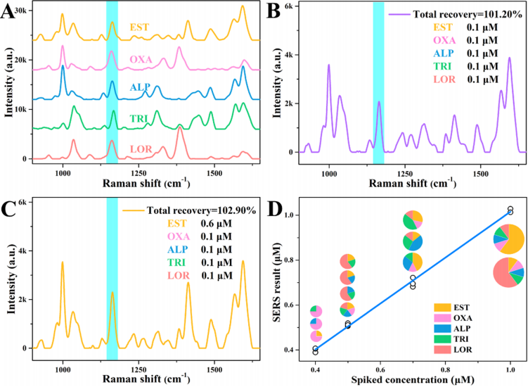 進(jìn)一步應(yīng)用于5種BZDs藥物總量的快速檢測,包括EST、奧沙西泮(OXA)、阿普唑侖(ALP)、三唑侖(TRI)和勞拉西泮(LOR)。由于此5種為同系物,有相同的骨架,擁有共同的特征峰,位于1163 cm-1,且濃度相同,對應(yīng)的峰強(qiáng)度也不變。激光共聚焦拉曼光譜儀為利用EST的線性工作曲線來定量檢測BZDs總含量提供了可行之處 (圖4)。在此,準(zhǔn)備了12個(gè)混合樣品,包括兩種、三種、四種或五種BZDs藥物的混合,也有濃度差異。實(shí)驗(yàn)測試結(jié)果表明,BZDs藥物的總濃度可以從EST的線性工作曲線直接獲得,測試結(jié)果與總加標(biāo)濃度具有很好的吻合度。將BZDs混合樣注射到小鼠體內(nèi),隨小鼠代謝采集不同時(shí)間的小鼠血清,發(fā)現(xiàn)血清中BZDs藥物總量隨小鼠代謝過程在開始階段迅速增加,12 h達(dá)到最大值,此后逐漸降低。這一變化趨勢與LC-MS/MS檢測結(jié)果一致,說明該基底及其SERS檢測方法對于定量檢測BZDs藥物是可靠且高效的。