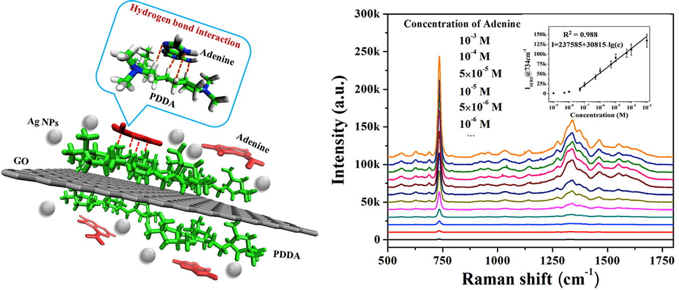 3、利用氫鍵在樣品富集和選擇性檢測中具有獨特的優(yōu)勢,采用自組裝法制備氧化石墨烯/聚二烯丙基二甲基氯化銨/銀納米粒子(GO/PDDA/Ag NPs)納米復(fù)合材料作為SERS基底,具備良好的穩(wěn)定性和SERS檢測的可轉(zhuǎn)移性;實現(xiàn)定量檢測水溶液中腺嘌呤含量,并對其他結(jié)構(gòu)相似的核酸堿基如鳥嘌呤、胞嘧啶、胸腺嘧啶具有良好的抗干擾能力。應(yīng)用DFT計算分析了PDDA與腺嘌呤間氫鍵作用的不同結(jié)合方式及其鍵能大小,為氫鍵的選擇性富集作用提供支撐。該研究工作發(fā)表于Talanta 2019, 204, 372-378。