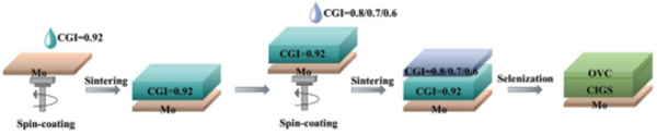 研究表明,在高效CIGS電池的吸收層表面通常存在一層貧銅組分的有序缺陷化合物(2VCu+InCu,OVC),OVC相可以極大提高CIGS/CdS異質(zhì)結(jié)質(zhì)量,從而提升CIGS器件效率。在液相法制備薄膜中,由于無(wú)法實(shí)現(xiàn)元素在制備過(guò)程中的實(shí)時(shí)調(diào)控,很難實(shí)現(xiàn)CIGS表面OVC的可控形成。近期,河南大學(xué)武四新教授課題組通過(guò)分析OVC相的形成機(jī)理,設(shè)計(jì)了一種在吸收層表面沉積貧銅CIGS化合物的方式,利用在硒化成膜過(guò)程中Cu元素的擴(kuò)散,實(shí)現(xiàn)CIGS表面OVC的制備。通過(guò)控制硒化溫度以及頂層和體相前驅(qū)體薄膜的Cu/(In+Ga)化學(xué)計(jì)量,可以實(shí)現(xiàn)Cu(In,Ga)Se2表面OVC相的可控制備(圖1)。