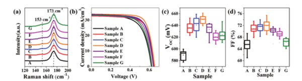 圖3 7種OVC結(jié)構(gòu)的拉曼光譜、J-V曲線和FF數(shù)