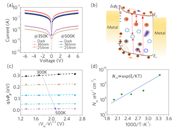 圖5.(a)在不同條件下器件的I-V曲線。(b)MSM ε-Ga2O3 SBPD的能帶示意圖。(c)不同溫度下勢壘高度作為(Vbi-V)的函數(shù)。(d)被占據(jù)的缺陷態(tài)密度的Arrhenius圖。