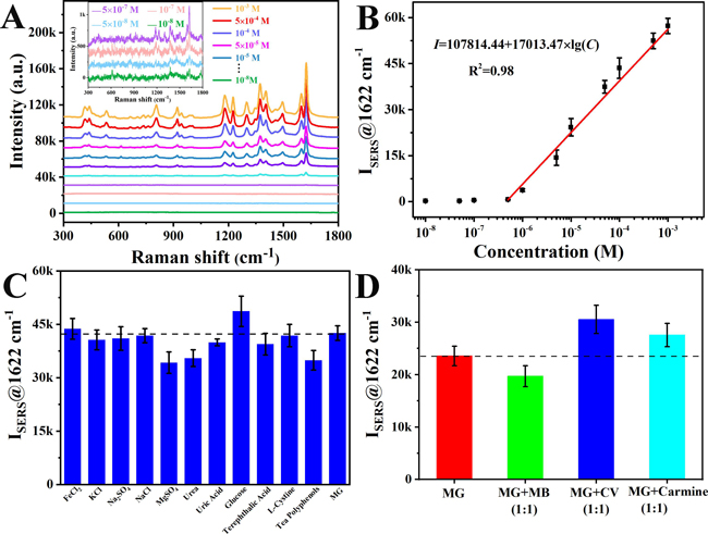 針對(duì)果汁MG殘留的檢測(cè),測(cè)得MG標(biāo)準(zhǔn)濃度的SERS譜圖(圖3),并由此得到峰強(qiáng)度與濃度的線性工作曲線,線性范圍為0.5~1000 μM ,LOD為10 nM;研究其抗干擾性。在實(shí)際樣品(梨和蘋(píng)果汁)的檢測(cè)中,獲得滿意的回收率。