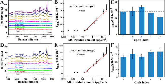 針對(duì)果皮表面MG殘留,采用擦拭法收集檢測(cè)。獲得峰強(qiáng)度與MG濃度的線性工作曲線:0.15~30 μg/cm2,LOD為3 ng/cm2;用乙醇清洗后可5次循環(huán)使用(圖4)。便攜式檢測(cè)應(yīng)用:食指滴有一滴10-2 M MG,然后連續(xù)在10個(gè)表面按壓,發(fā)現(xiàn)第10次按壓后,應(yīng)用便攜式拉曼光譜儀(785 nm)依然能測(cè)得MG的特征峰,為刑偵偵查提供可行性。