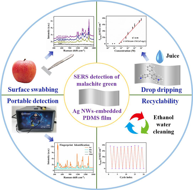 聚二甲基硅氧烷(PDMS)具有無(wú)毒、化學(xué)穩(wěn)定、柔性、韌性、可拉伸、疏水性等特點(diǎn),不僅有利于防止檢測(cè)液在其表面的擴(kuò)散,實(shí)現(xiàn)分析物的濃縮,而且還有利于其循環(huán)再利用,僅需簡(jiǎn)單的乙醇-水清洗。將貴金屬負(fù)載在PDMS表面,表現(xiàn)出優(yōu)異的SERS活性。盡管有文獻(xiàn)報(bào)道,這種表面負(fù)載形式也表現(xiàn)出強(qiáng)的粘附性和機(jī)械拉伸強(qiáng)度,但僅依賴PDMS本身的粘附性還遠(yuǎn)遠(yuǎn)不夠的,特別是面對(duì)各種特殊、惡劣環(huán)境下的檢測(cè)需求。鑒于此,蘭州大學(xué)葉為春教授課題組將商業(yè)Ag納米線(Ag NWs)與PDMS構(gòu)成嵌入式 Ag NWs@PDMS的柔性SERS基底,發(fā)展應(yīng)用于孔雀石綠(MG)的靈敏、快速和便攜式檢測(cè)。該基底表現(xiàn)出優(yōu)異的特性:抗拉伸、抗超聲和抗HNO3腐蝕、循環(huán)使用,在實(shí)際檢測(cè)應(yīng)用中,分別用于果汁MG殘留的液滴檢測(cè)、水果表面殘留的擦拭檢測(cè)及指紋殘留的便攜式檢測(cè)。