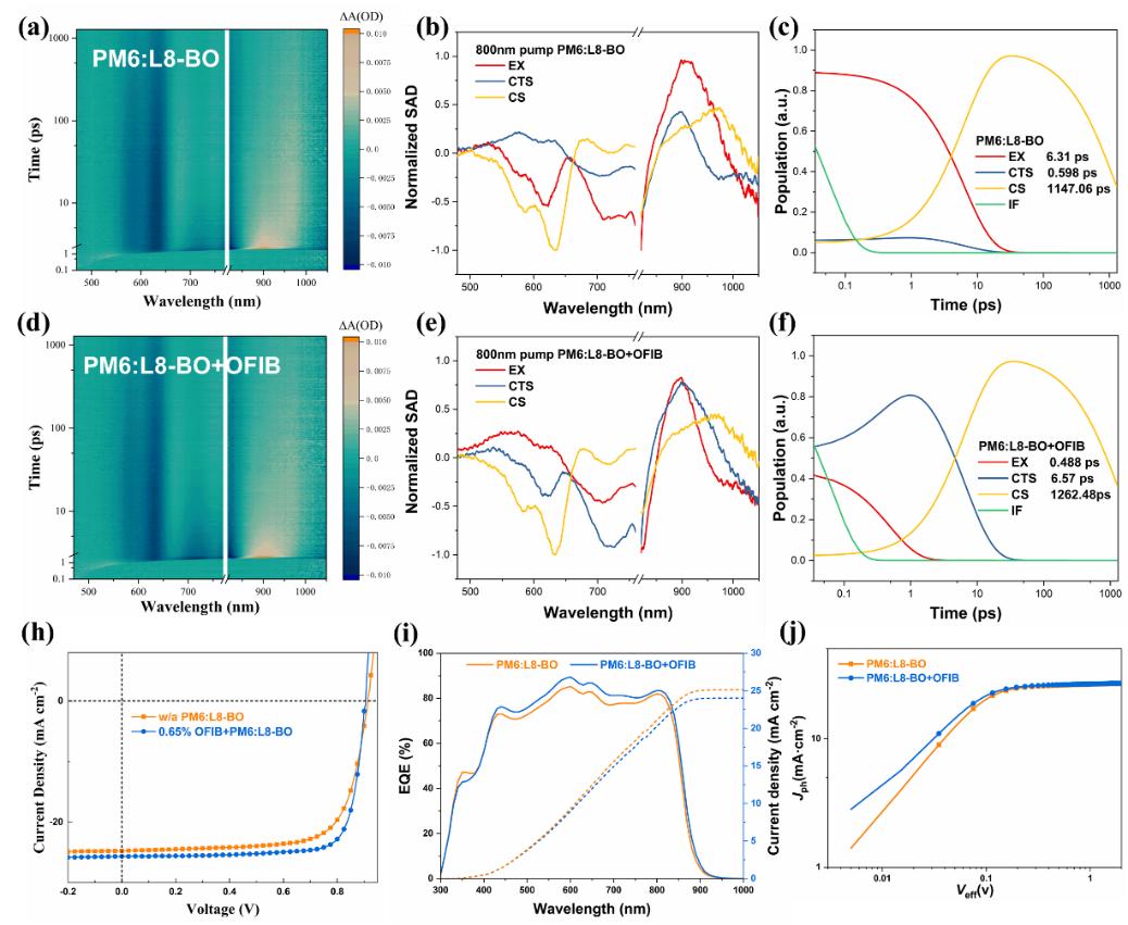 圖3. 聚合物太陽電池材料PM6:L8BO和PM6:L8BO+OFIB薄膜的超快動力學表征。