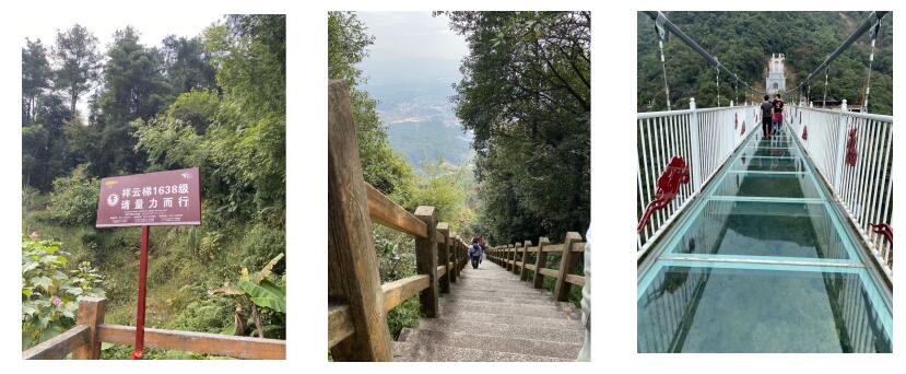 第一天的興奮還未散去,就開始了我們第二天的挑戰(zhàn)之旅。這一天我們挑戰(zhàn)了1638級的祥云梯,來到祥云梯腳下,只見告示牌上寫著“量力而行”四個字,極目望去,高不見頂,內心一陣掙扎,山不在于高,而因為陡,我們彼此相望,互相打氣,踏上這幾乎80°的階梯,然而挑戰(zhàn)并沒有結束,等待我們的還有一條全透明高空景觀玻璃橋,該橋全長316米,橋面通體透明,可以非常清楚地看到谷底的景色,如果在谷底仰望,玻璃上的人影也清晰可見。最終,一個都沒有少,我們登上了祥云梯,也走向更加驚險刺激的玻璃橋。