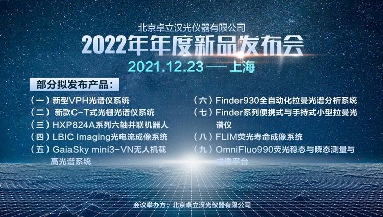 北京卓立漢光儀器有限公司將于2021年12月23日在上海舉行2022年年度新品發(fā)布會,多款自主研發(fā)的光電新品將重磅亮相,為新型材料、生物醫(yī)學、科學研究、食藥、環(huán)保等領域的用戶提供更優(yōu)的光電檢測技術和服務,期待與您相聚。