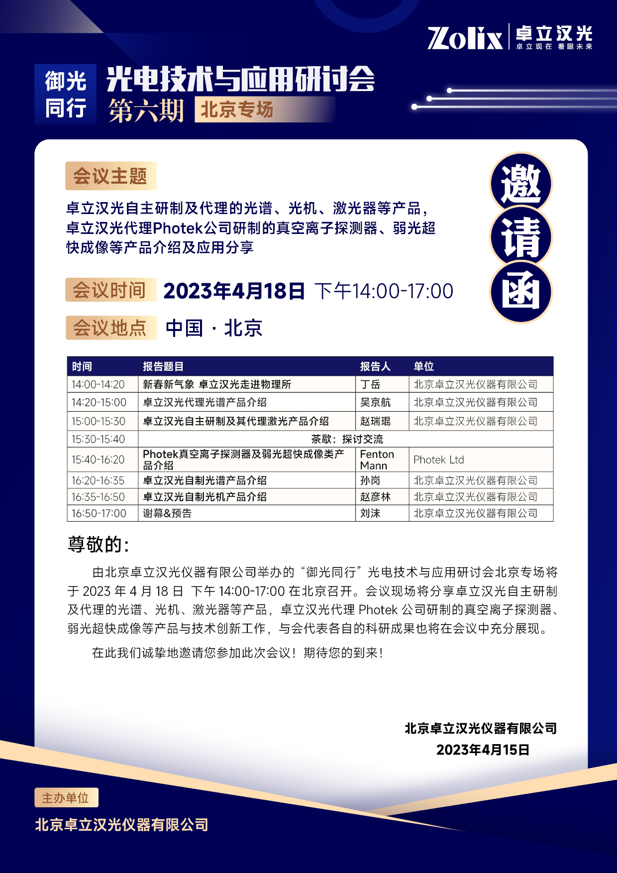 以專業(yè)、熱情的服務(wù)態(tài)度,為廣大用戶提供高規(guī)格、高質(zhì)量產(chǎn)品,是卓立漢光堅(jiān)持不懈的服務(wù)宗旨。期待卓立漢光 “御光同行”光電技術(shù)與應(yīng)用研討會(huì)可以為廣大科學(xué)工作者形成自由研討的學(xué)術(shù)氛圍,激發(fā)顛覆性創(chuàng)新泉涌,推動(dòng)科研成果工程化和產(chǎn)業(yè)化的進(jìn)程。