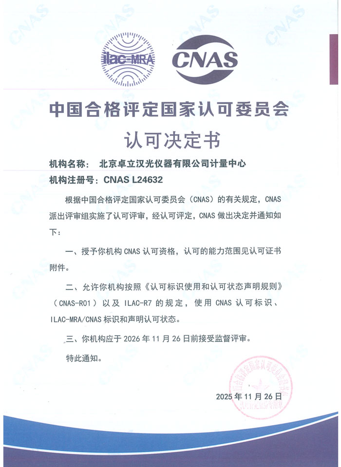 此次 CNAS 認(rèn)可,是對北京卓立漢光儀器有限公司計量中心技術(shù)實力與服務(wù)品質(zhì)的權(quán)威肯定,更是未來持續(xù)精進(jìn)的新起點。我們將始終秉持“精準(zhǔn)計量、服務(wù)產(chǎn)業(yè)”的使命,不斷優(yōu)化技術(shù)能力、提升服務(wù)水平,以更權(quán)威的資質(zhì)、更精準(zhǔn)的結(jié)果、更專業(yè)的服務(wù),為廣大客戶筑牢質(zhì)量基石,賦能產(chǎn)業(yè)高質(zhì)量發(fā)展,助力科研創(chuàng)新與市場競爭提供堅實的計量支撐!
