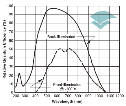 CCD 按受光方式可分為前感光和背感光兩種。前感光CCD 由于正面布置著很多電極,光經(jīng)電極反射和散射,不僅使得響應(yīng)度大大減低(量子效率通常低于50%),也因?yàn)槎啻畏瓷洚a(chǎn)品的干涉效應(yīng)使光譜響應(yīng)曲線出現(xiàn)馬鞍形的起伏;背感光CCD 由于避免了上述問(wèn)題,因而響應(yīng)度大大提高,量子效率可達(dá)到80% 以上。(如圖示)。