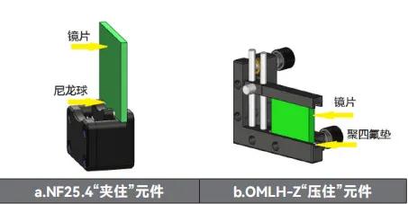 •光學元件厚度小于2.5mm時,推薦壓圈式(參見圖2a)裝卡方式; 光學元件厚度小于1mm時,使用壓圈式卡緊時,請使用隔圈(參見圖2b)保護