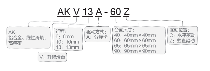 AKV系列鋁合金高精密手動(dòng)升降滑臺(tái)命名規(guī)則: