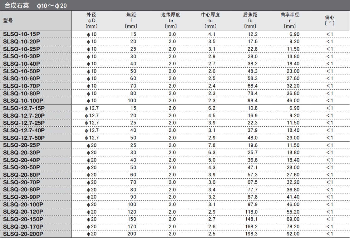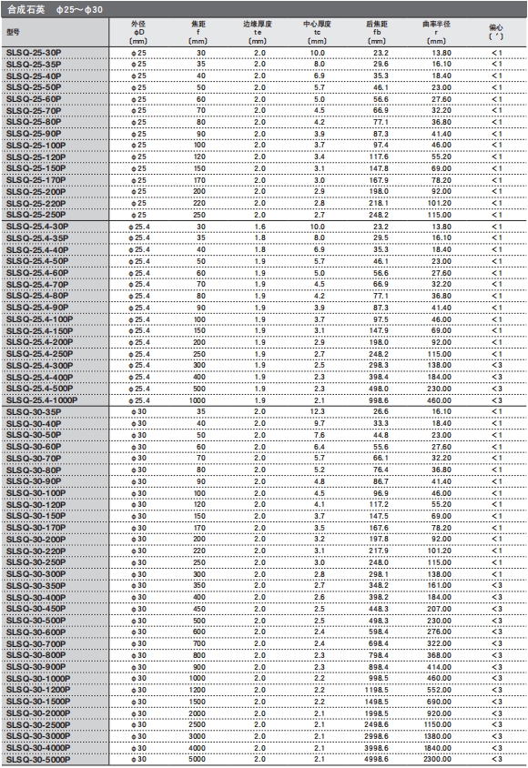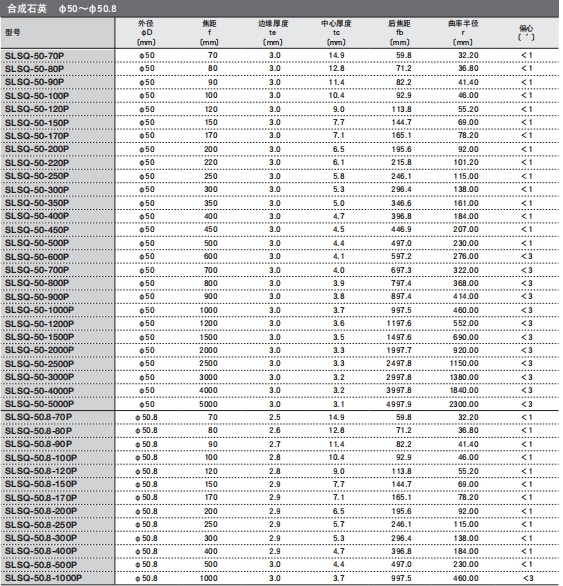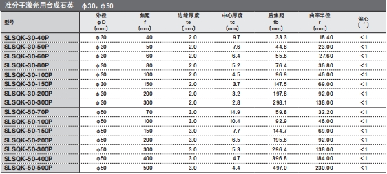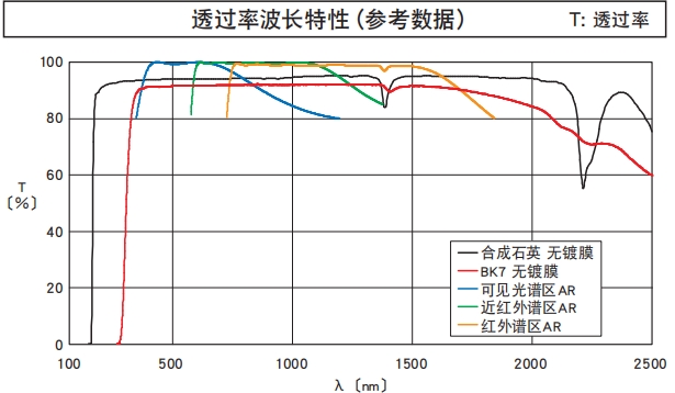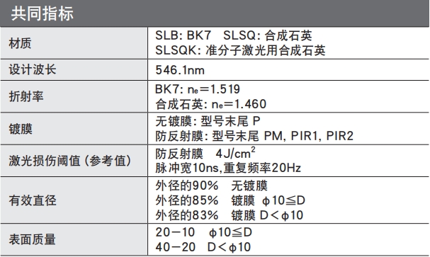 ?有從可見光到近紅外用的BK7材料的透鏡,和可用于350nm以下紫外光的高激光損傷閾值的合成石英透鏡,和適用于ArF(193nm)和KrF(248nm)的準分子激光用合成石英透鏡,這三種類型。