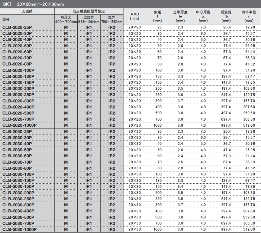 ?有從可見光到近紅外用的BK7材料的透鏡,和可用于350nm以下紫外光的高激光損傷閾值的合成石英透鏡這兩種類型。