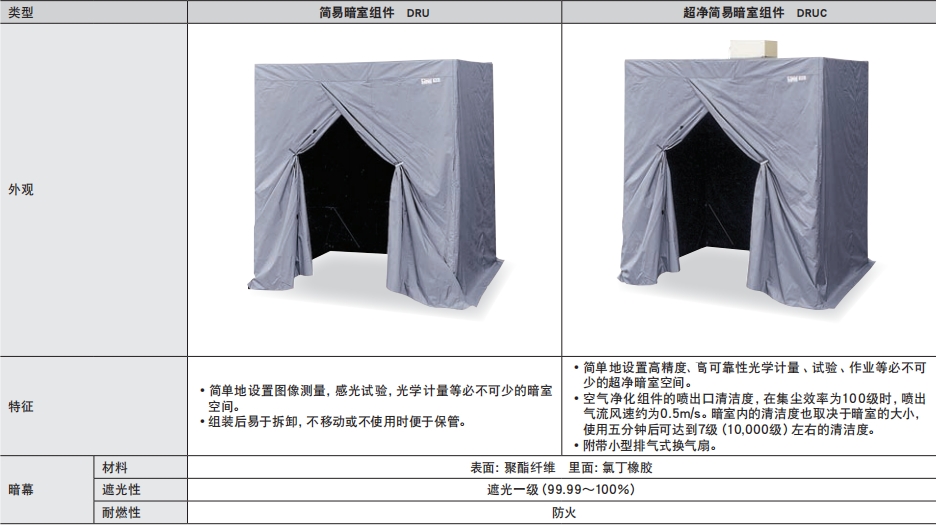 ?簡易暗室組件由暗幕,管材,塑料錘組成。一般的組裝時間:(例)組裝DRU-1816約需要30分鐘(兩人)。