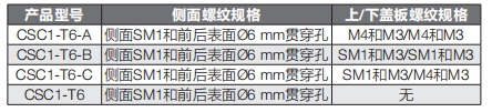 • CSC1-T6-A:前后表面Ø6 mm貫穿孔,側(cè)面SM1螺紋貫穿孔,上下蓋板中心M4螺紋貫穿孔,附帶一顆M4 x 7尼龍頭頂絲;