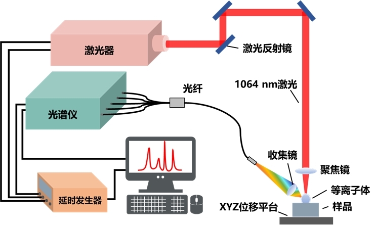 激光誘導(dǎo)擊穿光譜實(shí)驗(yàn)是通過超短脈沖激光聚焦樣品表面形成等離子體,對等離子體發(fā)射光譜進(jìn)行分析來確定樣品的物質(zhì)成分及含量。超短脈沖激光聚焦后能量密度較高,可以將任何物態(tài)(固態(tài)、液態(tài)、氣態(tài))的樣品激發(fā)形成等離子體,LIBS技術(shù)(原則上)可以分析任何物態(tài)的樣品,僅受到激光的功率以及探測光譜儀的靈敏度和波長范圍的限制。幾乎所有的元素被激發(fā)形成等離子體后都會發(fā)出特征譜線,因此,LIBS可以分析大多數(shù)的元素。