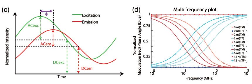 對連續(xù)激發(fā)光進行振幅調制后,分子發(fā)出的熒光強度也會受到振幅調制,兩個調制信號之間存在與熒光壽命相關的相位差,因此可以測量該相位差計算熒光壽命。