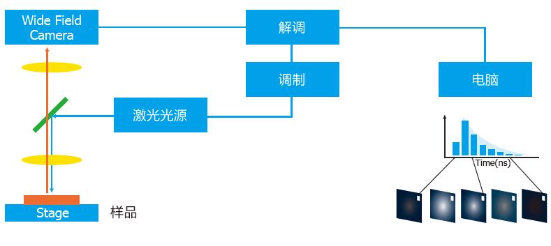 該技術是用平行光照明并由物鏡聚焦樣品獲得熒光信號,再由一寬場相機采集熒光成像。寬場FLIM 常用于快速獲取大面積樣品成像。時域或是頻域壽命采集都可以應用在寬場成像FLIM 上。寬場FLIM 有更高幀率和低損傷的優(yōu)勢。