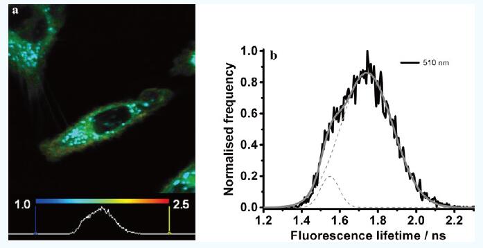 (b) 熒光壽命直方圖,脂肪滴的短壽命約在1.6ns 附近,細胞中其他位置壽命較長,在1.8ns 附近。