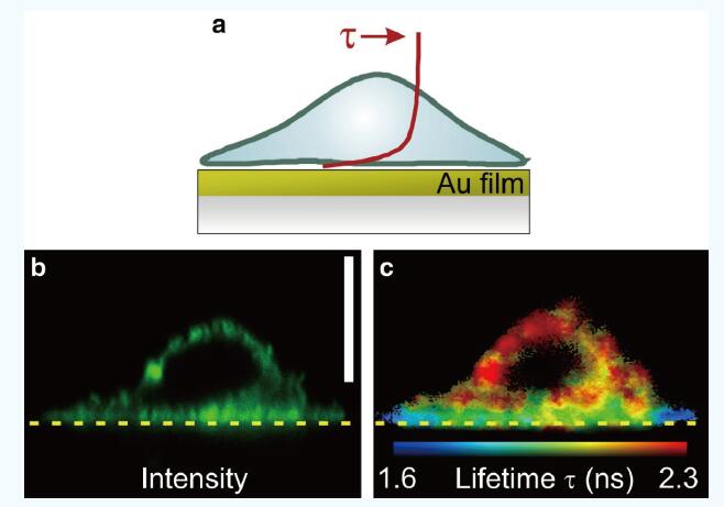 (c) b 圖的FLIM 圖,金表面附近的GFP 熒光壽命縮短。[2]