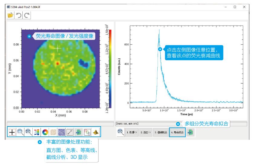 功能豐富的熒光壽命數據處理軟件,充分挖掘用戶數據中的寶貴信息。可自動對掃描獲得的FLIM 數據,逐點進行多組分熒光壽命擬合(組分數小于等于4),對逐點擬合獲得的熒光強度、熒光壽命等信息生成偽彩色圖像顯示。
