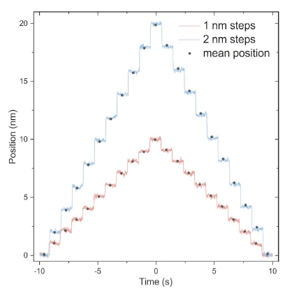 圖2:以 1 nm 和 2 nm 步 長(zhǎng) 分 別 進(jìn) 行 的 10 步 往 復(fù)測(cè)量。測(cè)量在距反射器 150 mm 處進(jìn)行,光學(xué)傳 感器頭精確對(duì)準(zhǔn)反射器中心。測(cè)量帶寬為 50 Hz, 每一步的平均位置數(shù)據(jù)點(diǎn)均通過對(duì)該步內(nèi)所有單 獨(dú)數(shù)據(jù)點(diǎn)(共 1000 個(gè))取平均值計(jì)算得到。