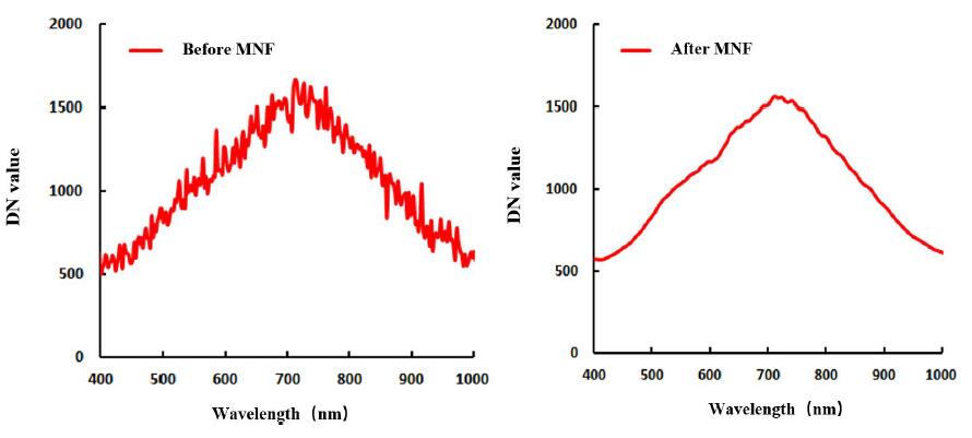 Next is the noise removal, this paper uses the more commonly used method of Minimum Noise Fraction Rotation (MNF) for noise removal. MNF is essentially two cascading principal component transformations. The first transformation (based on the estimated noise covariance matrix) is used to separate and recalibrate the noise in the data; this step results in noisy data with minimal variance and no inter-band correlation. The second step is the standard principal component transformation of the noise-whitened data (noise-whitened). For further waveform processing, the intrinsic dimensionality of the data is determined by examining the final eigenvalues and correlation images. The data space can be divided into 2 parts: one part is associated with larger eigenvalues and corresponding feature images, and the remaining part is associated with approximately the same eigenvalues and noise-dominated images. Since there is no whiteboard correction for this acquired hyperspectral image, the first step of data pre-processing radiometric calibration is not processed analytically, and the MNF noise reduction analysis is done directly. Figure 1 shows the changes of DN values in the imaged hyperspectral data before and after MNF noise reduction.