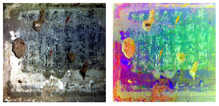 In order to objectively distinguish the variation of the internal components of the mural and the recognition of the mural handwriting, Principal Component Analysis (PCA) is performed on the pre-processed hyperspectral data to remove the redundant information between bands and compress the multi-band image information into a few converted bands that are more effective than the original bands. In general, the first principal component contains 80% of the variance information in the bands, and the first three principal components contain more than 95% of the information in all bands. Due to the uncorrelatedness among the bands, the foremost component bands can generate more colorful and better saturated color composite images. Fig.4 Compare and analyze the composite images of mural hyperspectral images before and after PCA changes, respectively.