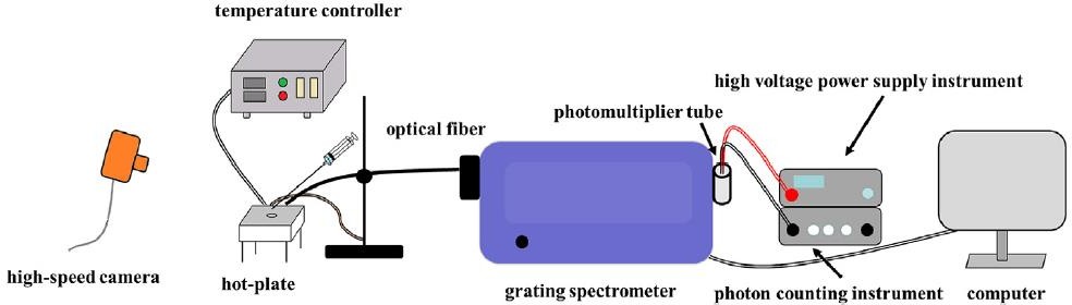 In the picture, scientists drop kerosene mixed with a certain proportion of activator onto the variable temperature table, which can be controlled from 100 degrees to more than 600 degrees. During combustion, the flame luminescence is collected into the spectrometer through an optical fibre, and the decay process of the luminescence band over time is monitored by the PMT. In the whole experiment, the emission band of the OH