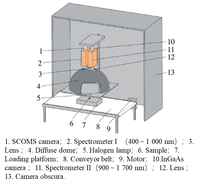 The hyperspectral imaging nondestructive testing platform built by the Biomass Packaging NDT Laboratory of Nanjing Forestry University is shown in Figure 1, including an imaging optical .The platform consists of an imaging spectrometer (GaiaField-V10E-AZ4, 400-1000nm), a detector (SCMOS camera), a white food-grade conveyor belt (HSIACSD800), an illumination system consisting of 1250W halogen lamps and a diffuse reflective dome, and a computer.