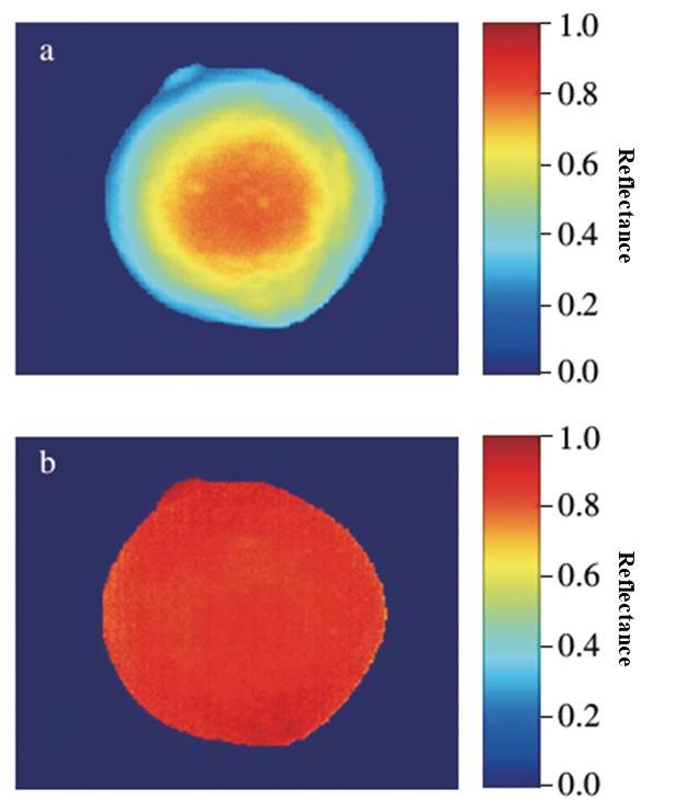 The large curvature of the Camellia oleifera fruits surface causes a large difference in the spectral intensity of each pixel point after hyperspectral imaging, and the spectral intensity from the central region of the Camellia oleifera fruits image towards the edges of the fruit gradually decreases, resulting in a lower spectral reflectance at the edges than at the center, which results in a larger error in modelling and classification using the data in this state directly, and is now corrected using the mean normalization method. 774 nm channel of the oil tea fruit sample The reflectance difference between the reflectance of the 774 nm channel and that of the background is the largest, so that this channel clearly shows the grey-scale map of the oil tea fruit samples. Figure 3 shows the pseudo-color distribution of the reflectance of the Camellia oleifera fruits seeds before and after correction in the 774 nm band, which shows that the distribution of the reflectance of the pixels of the oil seeds is more uniform than before correction, demonstrating the effectiveness of the mean normalization method.