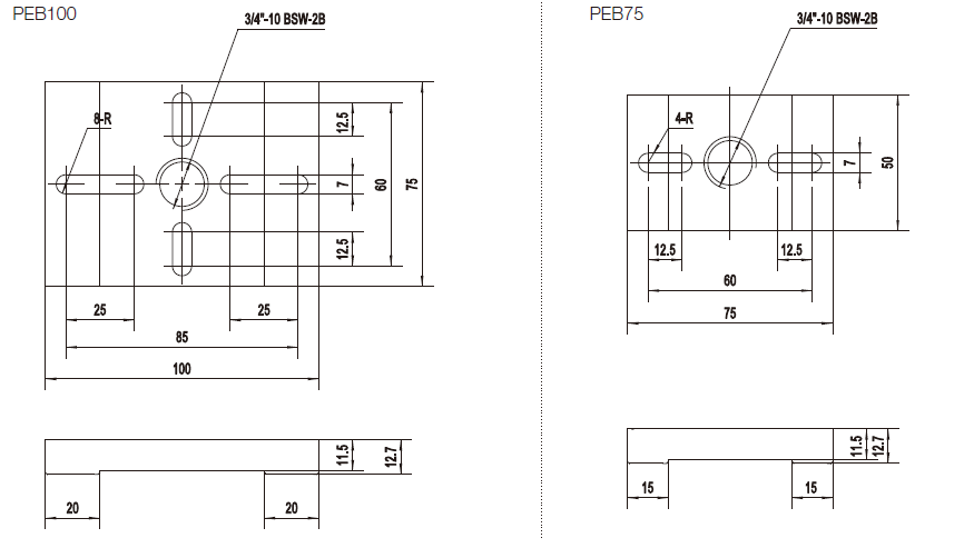 PEB75: Size 75mm×50mm , with counterbored slot at the longer direction.slot width is 7mm, the standard metric or imperial screws can fix the base on the optical table.