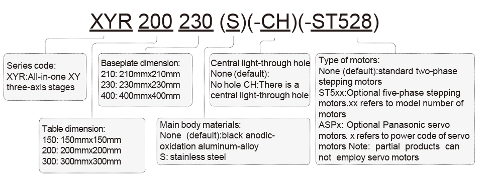 XYR series motorized all-in-one three-axis stages are parallel-type alignment systems for the workpieces which are needed to be scanned or aligned in production lines to meet requirements of high precision and high operation repetition rate. Each XYR all-in-one stage system includes upper-table, baseplate and four units of motion modular between them. Every module is guided by cross-roller guides and bearings. Three of them can be driven by short-lead ball screws, with standard stepping motors. Five-phase stepping motors and servo motors are optional. Central position of stages is used for keeping a light-through hole for transmission-type applications, or, keep a standard table without hole to meet the requirements of reflection-type operations.
