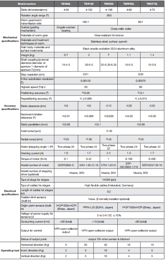 TBR series motorized rotation stages are designed by Zolix for meeting the strict requirements of high precision, high rigidity and high repetition rate for operation and being suitable for the applications of industrial automation fields. The worm gears used in TBF family are made of tin bronze which presents excellent wear-resistant performance. The matched worms are made of stainless steel and treated with high-frequency quench and provide high hardness and high rigidity. Good appearance comes from main body materials of black anodic-oxidation hard aluminum alloy. Fine cross-roller collar constitutes main part of guiding mechanism and present high strength, high loading capability and long-term durability. This series products can be operated horizontally, vertically and even inverted. Higher motion accuracy is guaranteed by fine-designed inner shaft structure. Generally this series of motorized rotation stages are suitable for being integrated with other equipment or operated in automatic production lines which locate in complex application situation and need higher long-term durability.