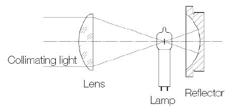 A spherical reflector collects the output from the rear of the lamp and focuses it on or near the arc, for collection by the condenser. The output is increased by as much as 60%.