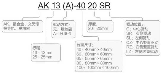 AK系列高精密手動(dòng)直線滑臺(tái)命名規(guī)則: